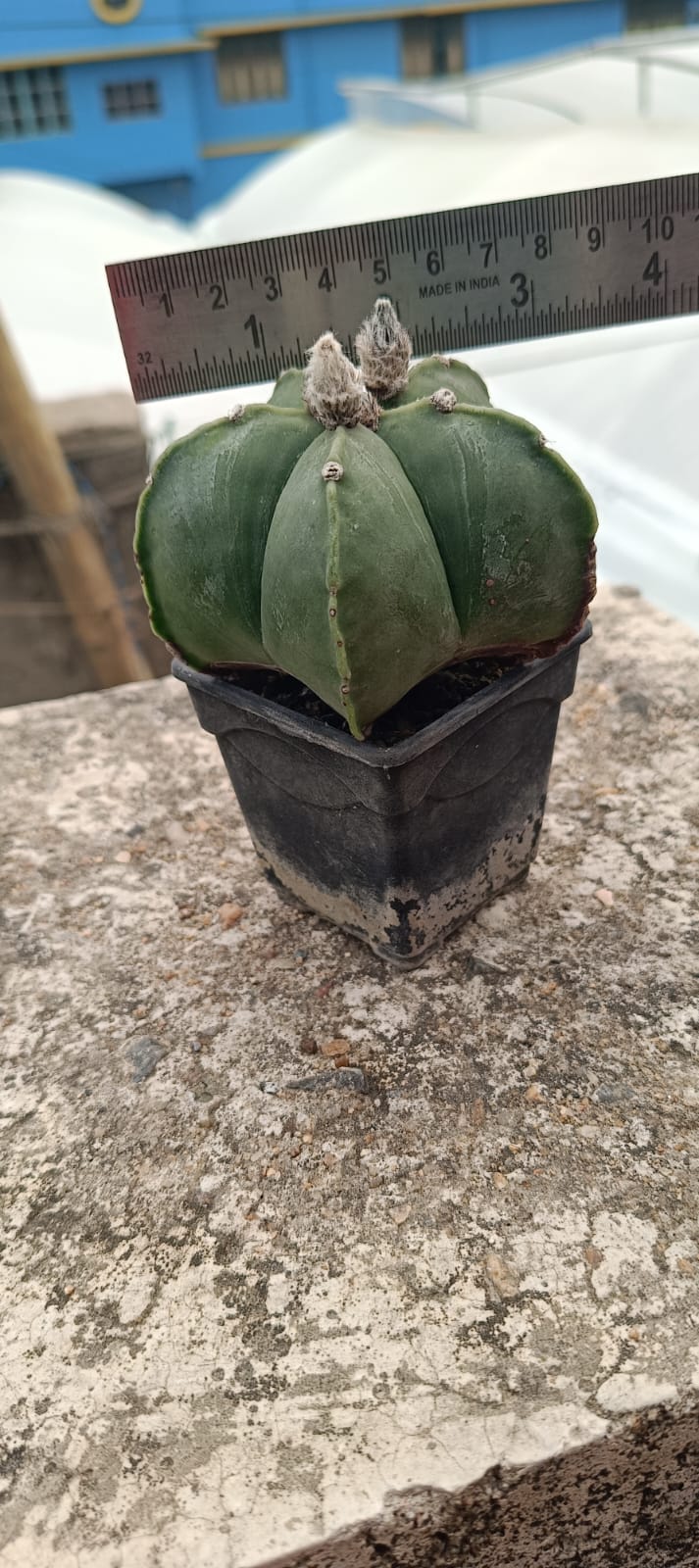 The Nudum cactus (specifically Astrophytum myriostigma var. nudum or A. asterias "nudum") is a spineless, smooth-bodied, globular cactus, renowned for its clean, green, star-shaped appearance, often called the "Bishop's Cap". It typically features five deep, distinct ribs (sometimes 3–10) and produces large, bright yellow flowers in spring and summer.